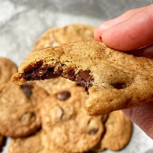 My chocolate chip cookie recipe is just one of thousands upon thousands out there in the world—but it does have a few aspects that make it dear to me. The first is that it is made with melted, not softened butter. This makes the cookies lightly crisp on the outside, soft and tender in the middle and eliminates the need for an electric mixer. The mixer-free method also means you can make cookies in even the most sparsely equipped kitchen – like, say a vacation rental.